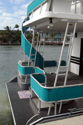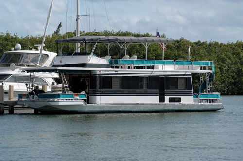 This is a "condo yacht" - not a houseboat, and is definitely a yacht in every sense of the word. The twin Chevy 350's with jet drives are ready to cruise. The kick-up rudders have been extended to be a foot deeper than originally, which makes a huge difference in steerage. Length: 55 feet Beam: 14 feet