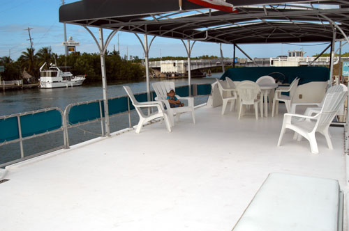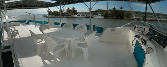 Another excellent feature of this yacht is the top deck, which extends the whole length of the yacht. There is another helm station up here, and a heavy duty 3000 lb. boat lift with a electric winch. Custom upper deck hypalon canvas cover w/complete enclosure curtains & deck chairs make this an exceptional lounging & entertainment area - rain or shine!